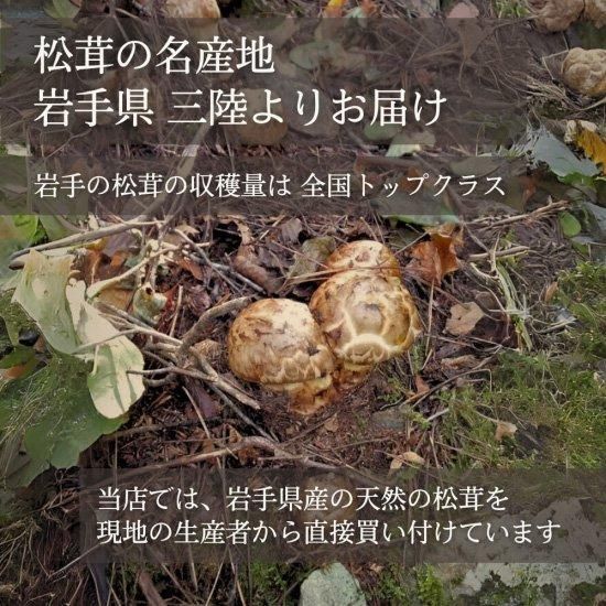 マルコシ商店の松茸は、地元の松茸名人がとってきた松茸を直接山へ行って買い付けをしているので、価格も鮮度もにっこり。熟練の松茸名人さんたちが、岩手の広い山の中から探し出した新鮮な松茸。お手元に届いた箱を開けたとたん、香りが漂います。天然物なので、大きさは、お任せとなります。